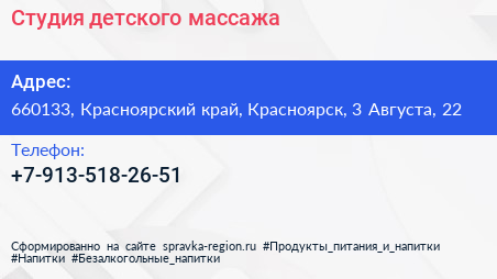Студия детского массажа по адресу 660133, Красноярский край, Красноярск, 3 Августа, 22 в дальнейшем Организация, размещена в следующих категориях: