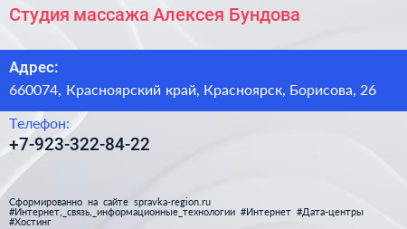 Студия массажа Алексея Бундова по адресу 660074, Красноярский край, Красноярск, Борисова, 26 в дальнейшем Организация, размещена в следующих категориях: