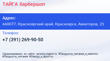 ТАЙГА, барбершоп по адресу 660077, Красноярский край, Красноярск, Авиаторов, 21 в дальнейшем Организация, размещена в следующих категориях: