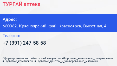 ТУРГАЙ, аптека по адресу 660062, Красноярский край, Красноярск, Высотная, 4 в дальнейшем Организация, размещена в следующих категориях: