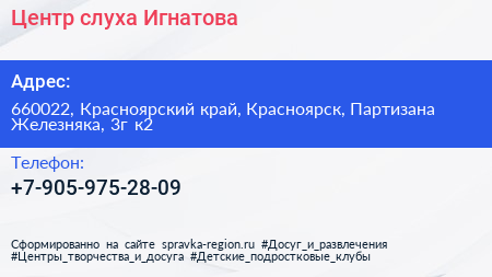 Центр слуха Игнатова по адресу 660022, Красноярский край, Красноярск, Партизана Железняка, 3г к2 в дальнейшем Организация, размещена в следующих категориях: