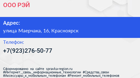 ООО "РЭЙ" по адресу улица Маерчака, 16, Красноярск в дальнейшем Организация, размещена в следующих категориях: