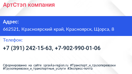 АртСтэп, компания по адресу 662521, Красноярский край, Красноярск, Щорса, 8 в дальнейшем Организация, размещена в следующих категориях: