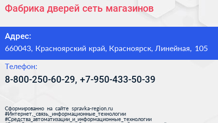 Фабрика дверей, сеть магазинов по адресу 660043, Красноярский край, Красноярск, Линейная, 105 в дальнейшем Организация, размещена в следующих категориях: