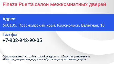 Fineza Puerta, салон межкомнатных дверей по адресу 660135, Красноярский край, Красноярск, Взлётная, 13 в дальнейшем Организация, размещена в следующих категориях: