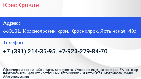 КрасКровля по адресу 660131, Красноярский край, Красноярск, Ястынская, 48а в дальнейшем Организация, размещена в следующих категориях: