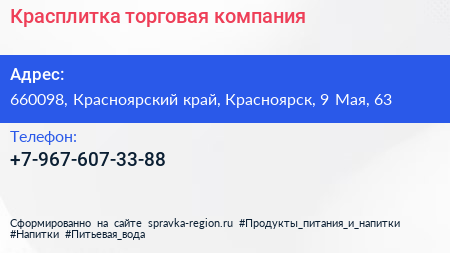 Красплитка, торговая компания по адресу 660098, Красноярский край, Красноярск, 9 Мая, 63 в дальнейшем Организация, размещена в следующих категориях: