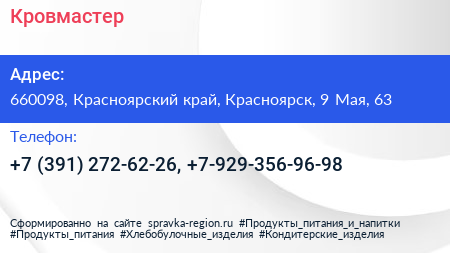 Кровмастер по адресу 660098, Красноярский край, Красноярск, 9 Мая, 63 в дальнейшем Организация, размещена в следующих категориях: