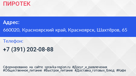 ПИРОТЕК по адресу 660020, Красноярский край, Красноярск, Шахтёров, 65 в дальнейшем Организация, размещена в следующих категориях: