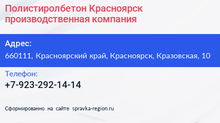 Полистиролбетон-Красноярск, производственная компания по адресу 660111, Красноярский край, Красноярск, Кразовская, 10 в дальнейшем Организация, размещена в следующих категориях: