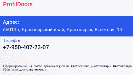 ProfilDoors по адресу 660135, Красноярский край, Красноярск, Взлётная, 13 в дальнейшем Организация, размещена в следующих категориях: