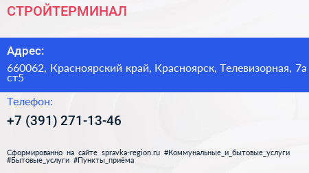 СТРОЙТЕРМИНАЛ по адресу 660062, Красноярский край, Красноярск, Телевизорная, 7а ст5 в дальнейшем Организация, размещена в следующих категориях: