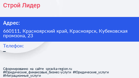 Строй Лидер по адресу 660111, Красноярский край, Красноярск, Кубековская промзона, 23 в дальнейшем Организация, размещена в следующих категориях: