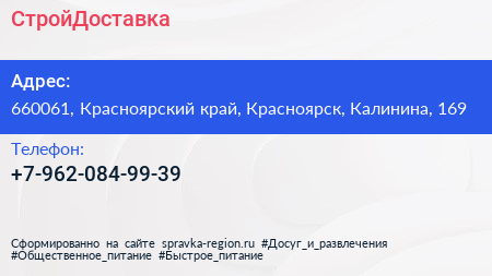 СтройДоставка по адресу 660061, Красноярский край, Красноярск, Калинина, 169 в дальнейшем Организация, размещена в следующих категориях: