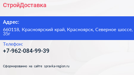 СтройДоставка по адресу 660118, Красноярский край, Красноярск, Северное шоссе, 35г в дальнейшем Организация, размещена в следующих категориях: