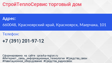 СтройТеплоСервис, торговый дом по адресу 660048, Красноярский край, Красноярск, Маерчака, 101 в дальнейшем Организация, размещена в следующих категориях: