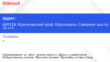 Южный по адресу 660118, Красноярский край, Красноярск, Северное шоссе, 5а ст1 в дальнейшем Организация, размещена в следующих категориях: