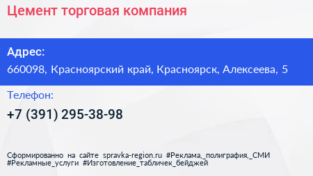Цемент, торговая компания по адресу 660098, Красноярский край, Красноярск, Алексеева, 5 в дальнейшем Организация, размещена в следующих категориях: