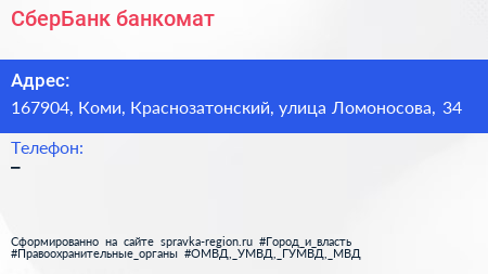 СберБанк, банкомат по адресу 167904, Коми, Краснозатонский, улица Ломоносова, 34 в дальнейшем Организация, размещена в следующих категориях: