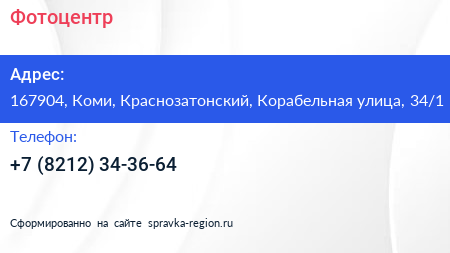 Фотоцентр по адресу 167904, Коми, Краснозатонский, Корабельная улица, 34/1 в дальнейшем Организация, размещена в следующих категориях:
