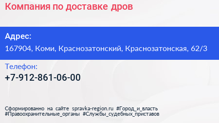 Компания по доставке дров по адресу 167904, Коми, Краснозатонский, Краснозатонская, 62/3 в дальнейшем Организация, размещена в следующих категориях: