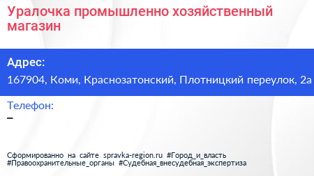 Уралочка, промышленно-хозяйственный магазин по адресу 167904, Коми, Краснозатонский, Плотницкий переулок, 2а в дальнейшем Организация, размещена в следующих категориях: