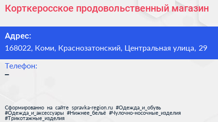Корткеросское, продовольственный магазин по адресу 168022, Коми, Краснозатонский, Центральная улица, 29 в дальнейшем Организация, размещена в следующих категориях: