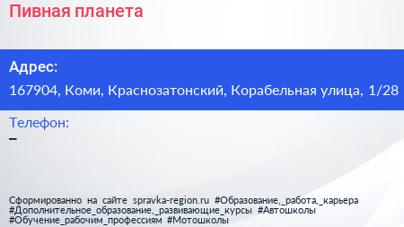 Пивная планета по адресу 167904, Коми, Краснозатонский, Корабельная улица, 1/28 в дальнейшем Организация, размещена в следующих категориях: