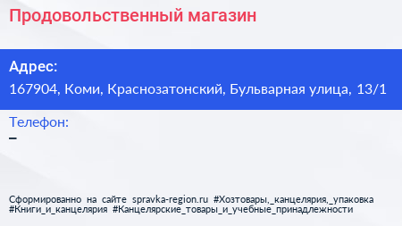 Продовольственный магазин по адресу 167904, Коми, Краснозатонский, Бульварная улица, 13/1 в дальнейшем Организация, размещена в следующих категориях: