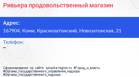 Ривьера, продовольственный магазин по адресу 167904, Коми, Краснозатонский, Новозатонская, 21 в дальнейшем Организация, размещена в следующих категориях: