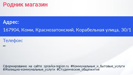 Родник, магазин по адресу 167904, Коми, Краснозатонский, Корабельная улица, 30/1 в дальнейшем Организация, размещена в следующих категориях: