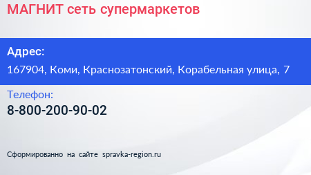 МАГНИТ, сеть супермаркетов по адресу 167904, Коми, Краснозатонский, Корабельная улица, 7 в дальнейшем Организация, размещена в следующих категориях: