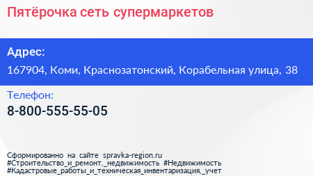 Пятёрочка, сеть супермаркетов по адресу 167904, Коми, Краснозатонский, Корабельная улица, 38 в дальнейшем Организация, размещена в следующих категориях:
