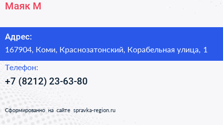 Маяк-М по адресу 167904, Коми, Краснозатонский, Корабельная улица, 1 в дальнейшем Организация, размещена в следующих категориях:
