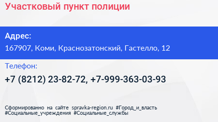 Участковый пункт полиции по адресу 167907, Коми, Краснозатонский, Гастелло, 12 в дальнейшем Организация, размещена в следующих категориях:
