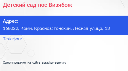 Детский сад, пос. Визябож по адресу 168022, Коми, Краснозатонский, Лесная улица, 13 в дальнейшем Организация, размещена в следующих категориях: