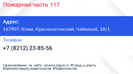 Пожарная часть №117 по адресу 167907, Коми, Краснозатонский, Чайкиной, 18/1 в дальнейшем Организация, размещена в следующих категориях: