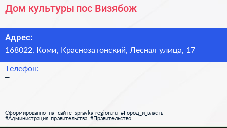 Дом культуры пос. Визябож по адресу 168022, Коми, Краснозатонский, Лесная улица, 17 в дальнейшем Организация, размещена в следующих категориях: