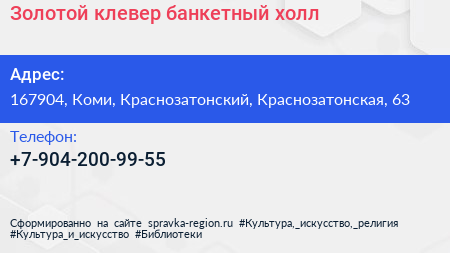 Золотой клевер, банкетный холл по адресу 167904, Коми, Краснозатонский, Краснозатонская, 63 в дальнейшем Организация, размещена в следующих категориях: