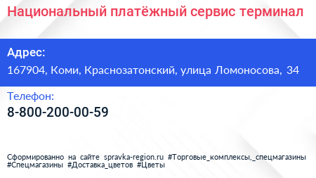 Национальный платёжный сервис, терминал по адресу 167904, Коми, Краснозатонский, улица Ломоносова, 34 в дальнейшем Организация, размещена в следующих категориях:
