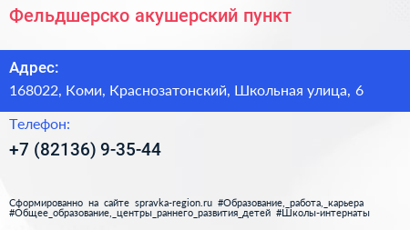 Фельдшерско-акушерский пункт по адресу 168022, Коми, Краснозатонский, Школьная улица, 6 в дальнейшем Организация, размещена в следующих категориях: