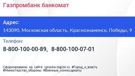 Газпромбанк, банкомат по адресу 143090, Московская область, Краснознаменск, Победы, 9 в дальнейшем Организация, размещена в следующих категориях: