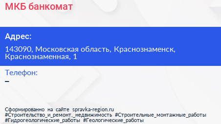 МКБ, банкомат по адресу 143090, Московская область, Краснознаменск, Краснознаменная, 1 в дальнейшем Организация, размещена в следующих категориях: