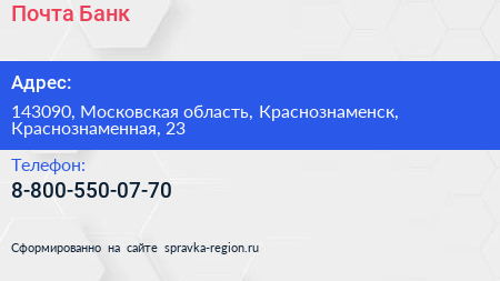 Почта Банк по адресу 143090, Московская область, Краснознаменск, Краснознаменная, 23 в дальнейшем Организация, размещена в следующих категориях: