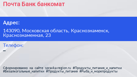 Почта Банк, банкомат по адресу 143090, Московская область, Краснознаменск, Краснознаменная, 23 в дальнейшем Организация, размещена в следующих категориях: