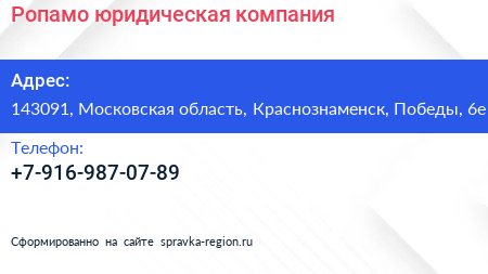 Ропамо, юридическая компания по адресу 143091, Московская область, Краснознаменск, Победы, 6е в дальнейшем Организация, размещена в следующих категориях: