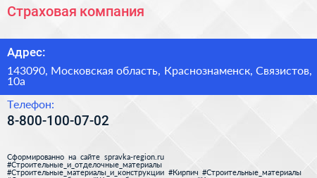 Страховая компания по адресу 143090, Московская область, Краснознаменск, Связистов, 10а в дальнейшем Организация, размещена в следующих категориях: