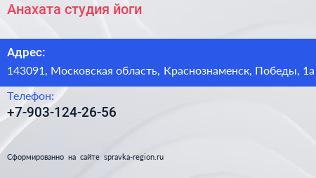 Анахата, студия йоги по адресу 143091, Московская область, Краснознаменск, Победы, 1а в дальнейшем Организация, размещена в следующих категориях: