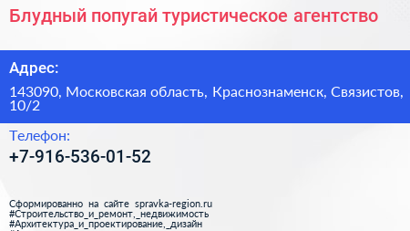 Блудный попугай, туристическое агентство по адресу 143090, Московская область, Краснознаменск, Связистов, 10/2 в дальнейшем Организация, размещена в следующих категориях: