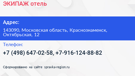 ЭКИПАЖ, отель по адресу 143090, Московская область, Краснознаменск, Октябрьская, 12 в дальнейшем Организация, размещена в следующих категориях: